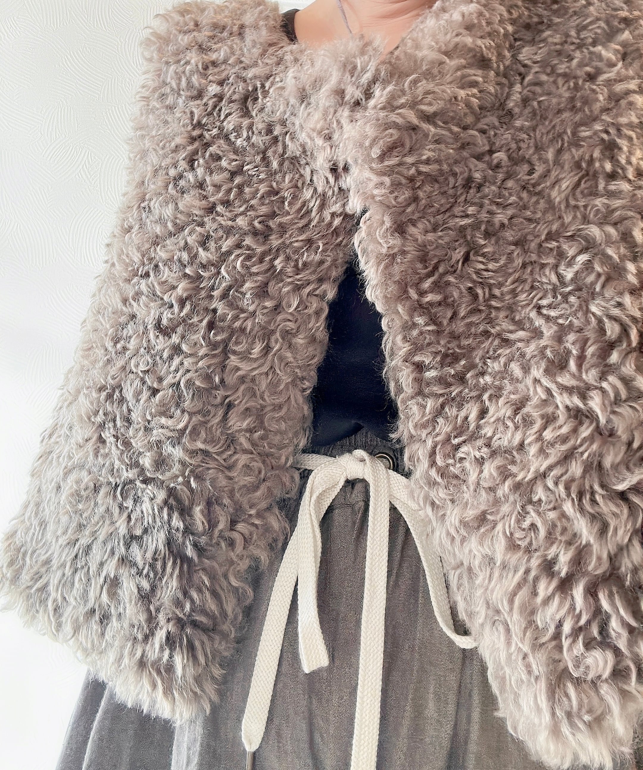 前身頃はカールファー、後ろ身頃は毛足短めのウールボアを組み合わせることで、