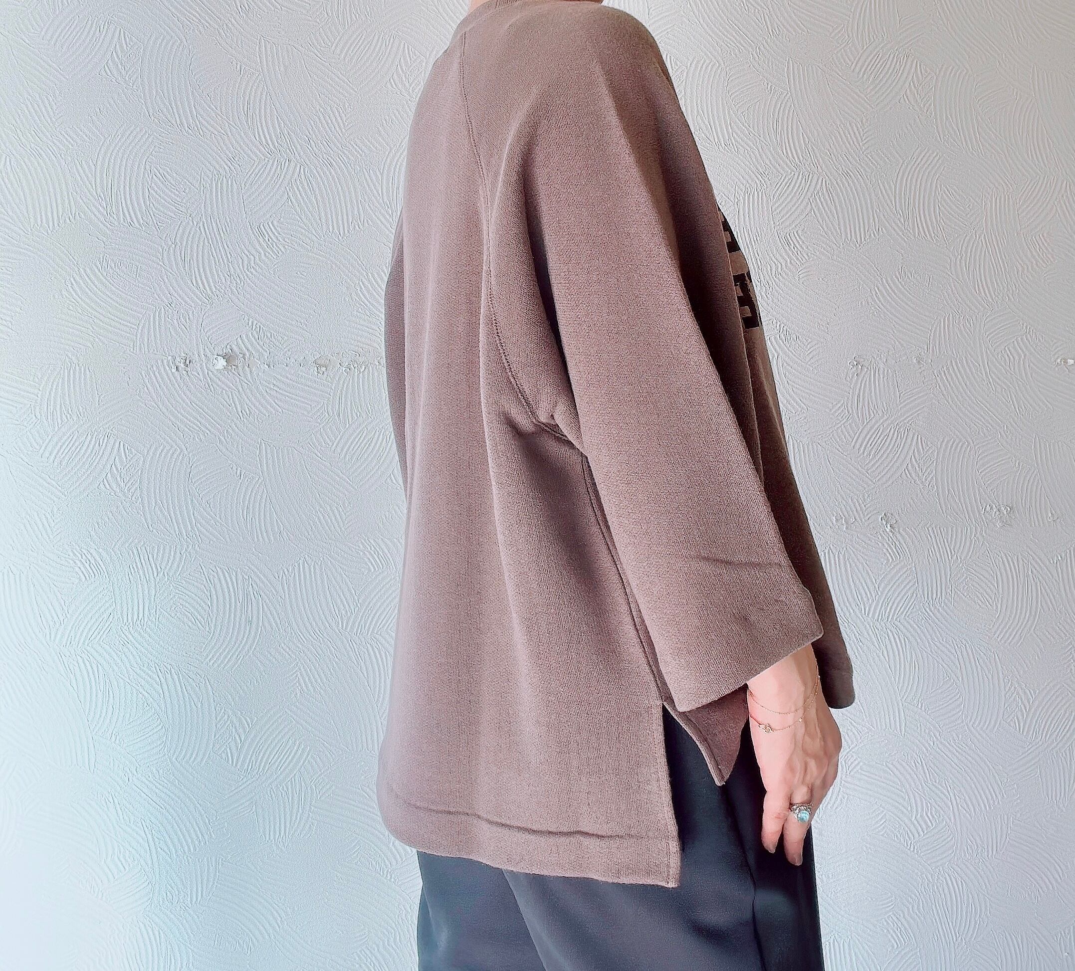 身幅はゆったりめですが、着丈を短めに設定することで、ボトムとのバランスが取りやすいシルエット。